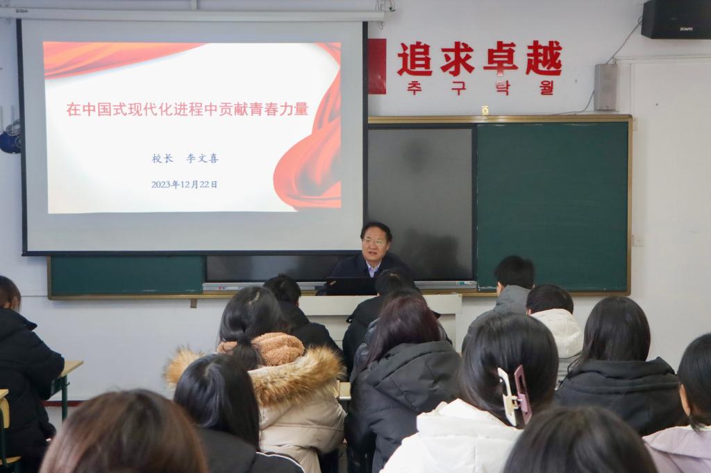 接着,李文喜走进教学一线,以“在中国式现代化进程中贡献青春力量”为题,为大学生讲授专题思政课。李文喜从“正确理解和大力推进中国式现代化”切入,围绕“以崇高理想引领人生远航”“以明德乐学成就无悔人生”“以担当奉献铸就浩然之气”“以过硬本领展现青年作为”四个方面向青年学子提出殷切期望:一要树立远大理想,筑牢信仰根基,做好自我设计,把好人生航向;二要锤炼品德修为,树立大格局大境界,小道义服从大道义,将自身道德素养汇成强大的精神力量;三要勇于担当奉献,担当责任使命,挺膺担当、奋发有为,在奉献中闪耀青春光华;四要练就过硬本领,培养创新思维,勇攀科技高峰,把青春奋斗融入党和人民事业。