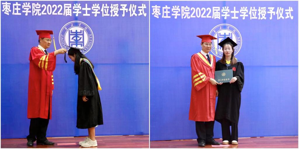 仪式在雄壮的国歌声中拉开帷幕。学院党总支书记滕聿峰宣读了《关于授予2022届beat365中文官方网站本科毕业生学士学位的决定》。校长李文喜为177名毕业生拨穗正冠、颁发学士学位证书并合影留念。