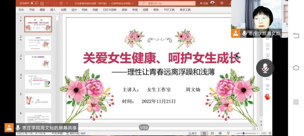 为普及女生健康意识,提高安全防范意识,加强心理健康教育,11月21日,beat365中文官方网站通过腾讯线上会议举行了“关爱女生健康,呵护女生成长”的安全健康教育讲座,2022级全体女生参加。