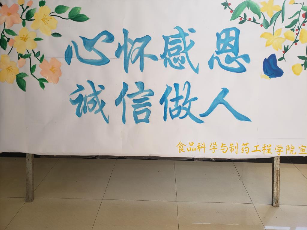 学院制作“心怀感恩,诚信做人”主题板报,悬挂“药食同源,情系枣院,服务社会,报效祖国”宣传条幅,激励学生要学会感恩,诚信为本。2018届获得资助的学生书写感恩心,表达对国家、社会和学校的感激之情。毕业生进行爱心捐赠,将自己的学习资料和书籍捐赠给低年级的同学,为家庭生活比较困难的学生减轻经济负担,传递求学上进、拼搏努力的精神。